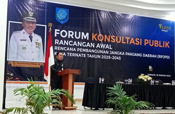 2024-01-22Sekretaris Daerah (Sekda) Kota Ternate, Maluku Utara, Dr. Rizal Marsaoly secara resmi membuka Forum Konsultasi Publik Rancangan Awal (Ranwal) Rencana Pembangunan Jangka Panjang Daerah (RPJPD) Kota Ternate Tahun 2025-2045 bertempat di Ballroom Jati Hotel K